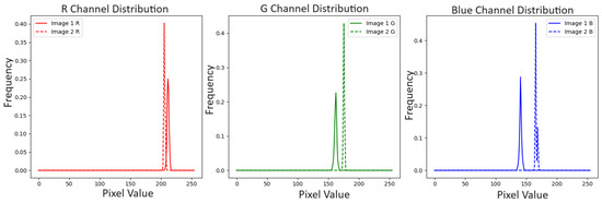 RGB colour difference of two different images(150 px/150 px) of 10R-5-1 colour chip captured at different times. Image1 was captured at 9 a.m. and Image2 captured at 1 p.m. of the same day. The x-axis represents the pixel values (0–255). The y-axis represents the normalized frequency of the pixel values.