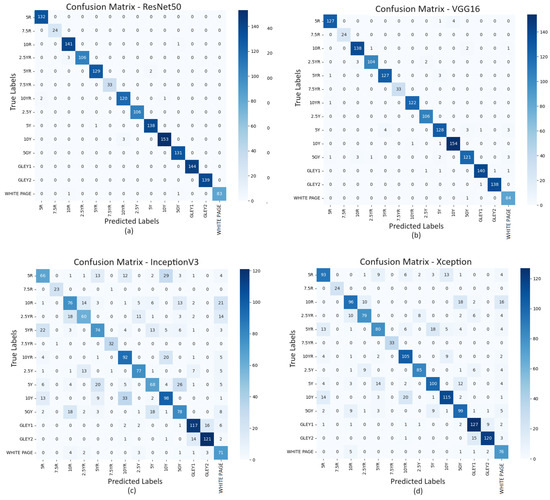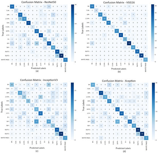 Confusion matrix of page-by-page prediction for ResNet50 (a), VGG16 (b), InceptionV3 (c), and Xception (d) with primary dataset.