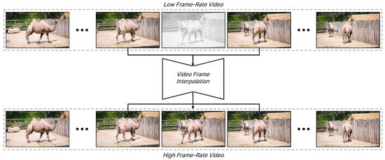 Recently, there has been an increasing demand for high-resolution and high-frame-rate videos. As a result, Video frame interpolation technology is being applied in various fields, similar to super-resolution [1,2,3,4,5,6,7,8,9] and denoising [2,10,11,12,13,14], and there is active development of models using deep learning. Video frame interpolation (VFI) is a task that creates an intermediate frame using the two surrounding frames, resulting in slow-motion effects or high-frame-rate videos. For example, information is gathered from both surrounding frames to synthesize the gray frame, and this process continues along the time axis, as shown in Figure 1. VFI has a wide range of applications, from research areas such as video compression, slow-motion generation, and view synthesis to practical devices used in television, streaming, and gaming video. With the increasing prevalence of high-resolution videos, there is a growing need for video frame interpolation (VFI) technologies that can handle 4K resolutions and above. However, research on VFI specifically for high-resolution videos is still limited.