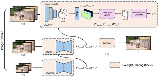 where rounds up a float number to an integer. Therefore, as the resolution of the input increases, the value of the level also increases. In Figure 2, for the sake of convenience in explanation, the level value is set to 3, and the size of the resolution corresponding to level 0 in the image pyramid is 1/4. To optimize this network for high-resolution VFI, we conduct end-to-end training through three steps.