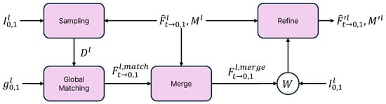 where refers to the scaled dot-product attention mechanism and indicates the selection of the top k points guided by . Here, the method for determining k in the is based on the proposed sampling method. In global matching, the predicted flow is matched against the damaged areas using as a guideline. As a result, the output () can directly compensate for the damaged regions of the predicted flow. Similar to sampling, since the output is generated through forward warping, the final update is performed using the subsequent merge and refine modules.