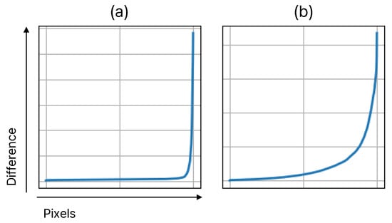 The distributions of of two different images. The subfigures (a,b) represent the distribution of difference maps from two different images. “Pixel” refers to the number of pixels in the image, while “difference” indicates the difference value at each pixel.