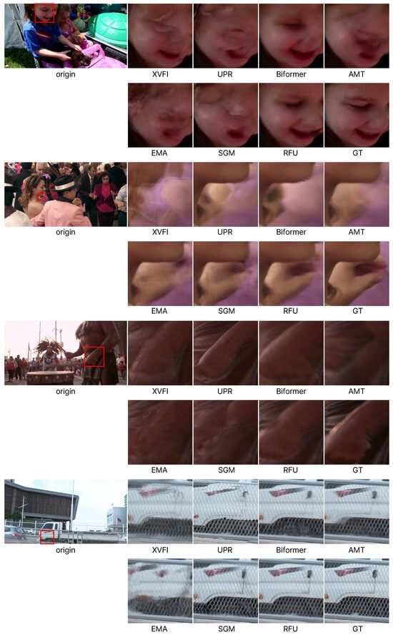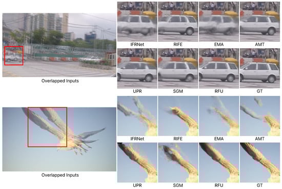 Figure 6 presents results for low-resolution videos with large motion. Unlike Figure 5, in which a model designed for 4K resolution is used, this comparison includes algorithms that are not specifically focused on 4K [24,25]. The large image on the left overlays the two input images to illustrate the extent of motion, and the regions of overlapped inputs highlighted by red boxes are displayed on the right. In the first image, while existing models show a significant distortion of the structure of the car, our proposed model presents results that closely resemble the ground truth. In the second video, we can observe large motion as a bird flaps its wings. Other models encounter issues such as missing or duplicated wings, whereas our proposed model accurately represents the wings as a single object. This demonstrates that our approach is not only effective at 4K resolution but also robust in handling videos with large motion.