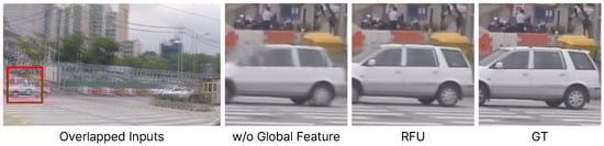 The global flow update (GFU) module is a crucial component that compensates for the degradation of predicted flow () by acquiring global information from the global feature extractor. To assess the impact of this module, we compare the performance of the model trained without the GFU. As seen in the last row of Table 2, the overall performance is lower in terms of PSNR. Nevertheless, since quantitative evaluation does not effectively reveal the impact on the generation of high-resolution images, we also conduct a qualitative assessment. Figure 7 visualizes the results by selecting one image from Figure 6. The model without a GFU module struggles to capture global information, which makes it challenging to restore vehicles with large motion. Overall, this indicates that the GFU module plays a vital role in enhancing flow to ensure robustness against high-resolution images and large motion.
