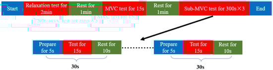 The specific experimental procedure is illustrated in Figure 2. The process began with the collection of EEG signals from healthy participants in a relaxed state for 2 min, followed by a 1 min rest period. Subsequently, the MVC force of the right hand was measured for each of the 11 participants. Each subject performed the MVC test for 5 s to ensure accuracy, repeating the task thrice. The MVC for each participant was determined by calculating the average of these three measurements.