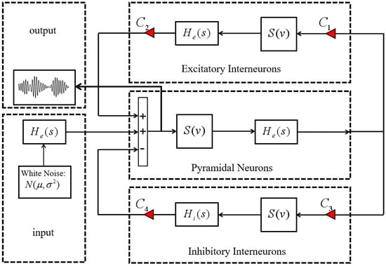 The basic single-channel neural mass model consists of three primary subpopulations: the pyramidal cell population, the excitatory interneuron population, and the inhibitory interneuron population [8], as illustrated in Figure 3. A static nonlinear function is employed to convert the average presynaptic membrane potential into the average spike density, representing the mean firing rate. This mean firing rate then serves as the input for the linear transformation function, as described in Equation (4):