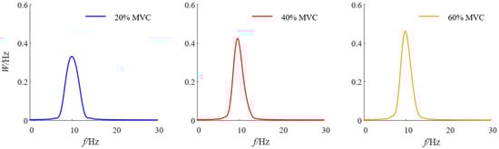 The primary motor cortex is significantly activated during skilled movement of the contralateral limbs [30,31]. EEG signals from the left motor area were selected for analysis. Initially, a segment of EEG data was extracted from the 5–15 s interval, during which the static grip force output remained relatively stable. Each data segment length contained 10,000 points. Following the method described in Section 2.2, EEG signals from 11 healthy participants were preprocessed under grip forces corresponding to 20%, 40%, and 60% MVC. Subsequently, the alpha rhythm (8–12 Hz) of the contralateral cortical regions’ signal was extracted using bandpass filtering.