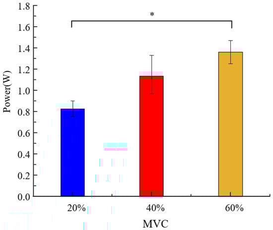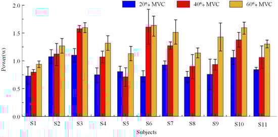 To provide a clearer representation of energy changes in the alpha rhythm under different constant grip forces, the power spectral density of the alpha rhythm for all 11 participants was integrated to calculate the average power of the alpha rhythm in the EEG signal. The results, shown in Figure 5, indicate that the average power of the alpha rhythm signal increased with grip force, despite individual variability. Notably, the average power of the alpha rhythm at 60% MVC was significantly higher than at 20% MVC across all 11 participants.
