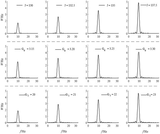 The single-channel neural mass model exhibits distinct types of dynamic behaviors depending on the values of the average synaptic connection number J, excitatory average synaptic gain Ge, and inhibitory average synaptic gain Gi. With all other model parameters set to the typical values (as detailed in Table 1), the effects of , Ge, and Ge on the power spectral density of the model’s output signals were analyzed. Additionally, this study investigated how these parameters influence the average power of the alpha rhythm in the model’s output signals. Specifically, J was set with a baseline of 135 and adjusted in intervals of 0.1, Ge was set with a baseline of 3.25 and adjusted in intervals of 0.001, and Gi was set with a baseline of 22 and adjusted in intervals of 0.01.