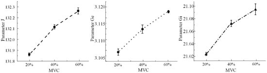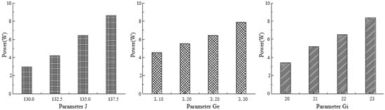 To further analyze the impact of the model parameters on the average power of the output signals, the power spectral density of the model’s output signals was integrated. The results, as shown in Figure 8, indicate that the average power of the model’s output signals gradually increases with increases in the parameters , , and .