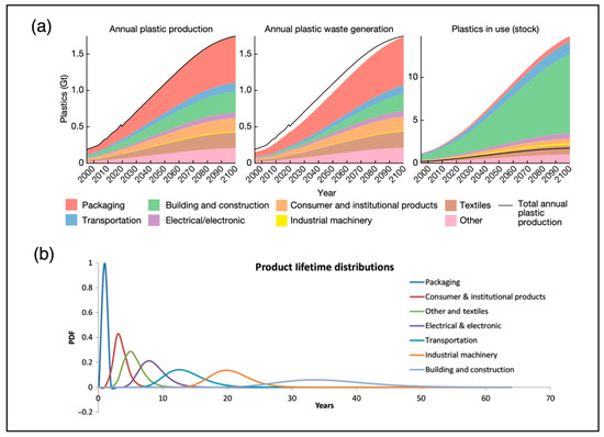 Global plastic demand and life cycle by sector. (a) Global plastic production, waste, and in-use volume projections from 2000 to 2100 (Stegmann et al., 2022) [1]. (b) Product life cycle by sector (Geyer, R. et al., 2017) [2].
