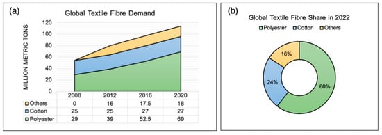 The trends and shares of the global textile demands. (a) Global textile demands for polyester, cotton, and others. (b) Global textile demand share percentages in 2020 (redrawn based on [3]).
