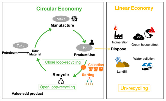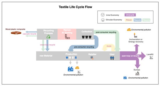 The textile life-cycle flow includes un-recycling, reuse, and closed-loop and open-loop recycling. The un-recycling of waste textiles is in the linear economy, while the 2Rs of reuse and recycling are in the circular economy (redrawn from (MDBC, 2021) [3]).