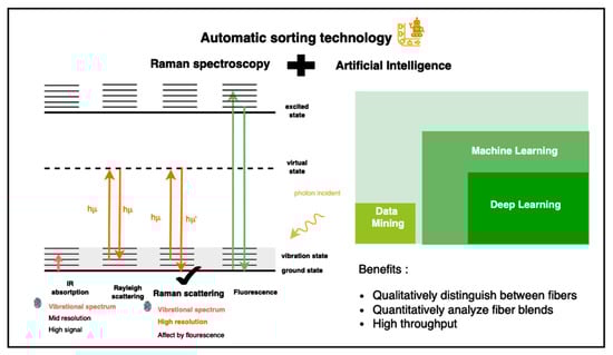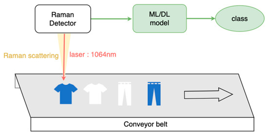 Vibrational spectroscopy [6], including near-infrared (NIR) [7] and Raman techniques [8,9,10], is widely used to analyze molecular compositions. NIR spectroscopy relies on vibrational bond absorption (from 780 nm to 2526 nm), while Raman spectroscopy detects vibrational states through inelastic scattering. We utilize informative Raman spectra as a vibrational spectrum for analyzing textiles’ compositions, which serve as chemical fingerprints. We combine the AI model with Raman spectroscopy for qualitative and quantitative fiber analysis to classify fibers into purer categories and increase the flow of closed-loop recycling, as shown in Figure 6.