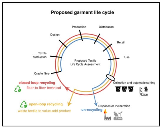 - Payne, A. Open-and closed-loop recycling of textile and apparel products. In Handbook of Life Cycle Assessment (LCA) of Textiles and Clothing; Woodhead Publishing Series in Textiles: Delhi, India, 2015; pp. 103–123. [Google Scholar] [CrossRef]