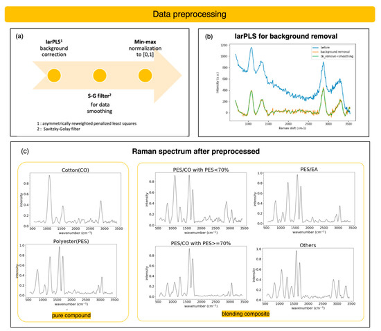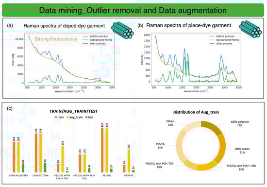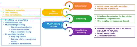 Due to the limited availability of waste-textile samples and dye-related fluorescence in the Raman data, we carefully manage Raman data through a series of steps. These steps include data collection, data preprocessing, data mining, machine learning (ML) or deep learning (DL) training, and model training and testing,, as shown in Figure 9.