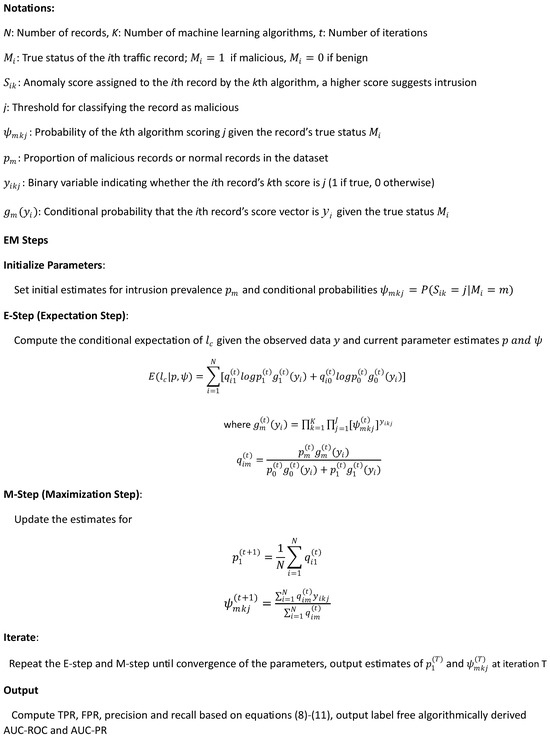 The EM-AUC algorithm consists of two steps: the E-step and the M-step. In the E-step, the true intrusion status (i.e., perfect labels) are treated as missing data and replaced with their probabilities when calculating the conditional expectation of the complete data log-likelihood. The probabilities are typically initialized using a random variable generator and updated during the M-step. As a result, the labels are no longer needed. In the M-step, the key parameter estimates required for computing AUC-ROC and AUC-PR are updated by maximizing the conditional expectation of the complete log-likelihood. The key parameters include the intrusion prevalence , which represents the probability of the kth algorithm scoring j given the record’s true status. This iterative process continues until convergence, optimizing the parameter estimates to fit the observed data.