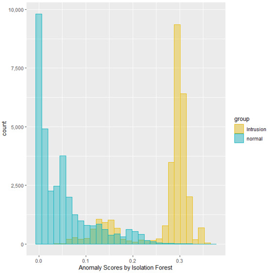 This section summarizes the results from running experiments on the NSL-KDD dataset. Anomaly scores can demonstrate overlap between two classes in their distribution. For instance, the histogram in Figure 3 depicts the distribution of anomaly scores generated by the Isolation Forest, grouped by the intrusion labels for a specific test dataset. The green area represents the distribution of anomaly scores for the labeled normal traffic, while the yellow area represents the distribution for the labeled intrusion traffic. Notably, the scores indicate a separation between normal and intrusion traffic with some overlap.