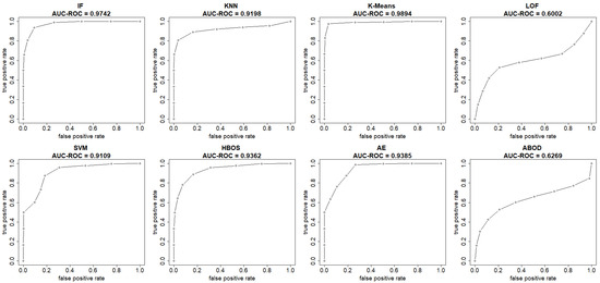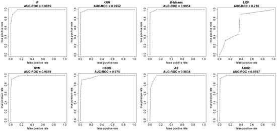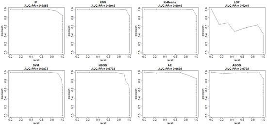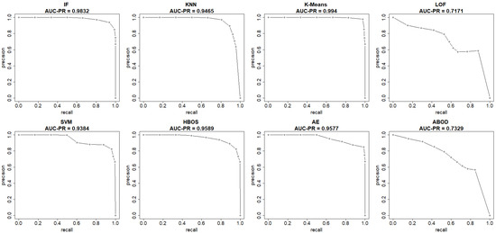 The ROC curve for the kth unsupervised model is obtained by connecting the coordinate pairs of (FPR, TPR). Similarly, the precision-recall curve is constructed by plotting the coordinate pairs (recall, precision), as shown in Equations (10) and (11). The area under the curves can be calculated using the trapezoidal rule.