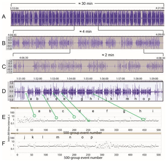 Rumination patterns of jaw movement from time-based and event-based perspectives. Panels (A–C) are waveforms of the sound signal taken from one foraging route (KDE, Dry, 29 October 2013) at different scales of enlargement spanning 30, 4, and 2 min, respectively. Panel (D) shows the waveform of a 7 min bout of rumination from a different foraging route (KDE, Wet, 6 April 2014); panels (E,F) show the corresponding event-based plot; corresponding boli have matching lower-case letters.