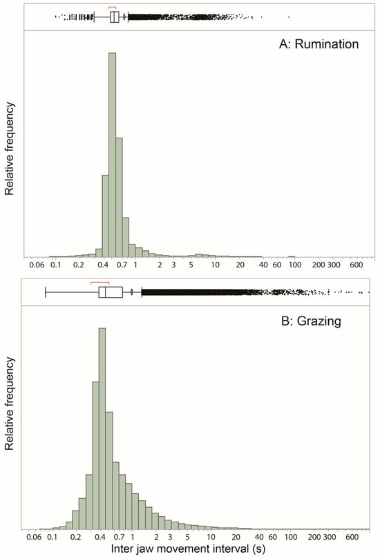 Frequency distribution of the inter-jaw-movement interval (s) for (A) rumination and (B) grazing, with logarithmic scaling. The extreme low end of the distribution may be due in part to false positive identifications of jaw movements. In the outlier box plots, the box center line is the median; box ends are 1st and 3rd quartiles; whiskers extend from box ends to the outermost value within the 1st/3rd quartile –/+ 1.5 × interquartile range; the center line of the confidence diamond is the mean and the lower and upper 95% of the mean (the left and right points of the diamond); and the bracket above box is the shortest half—the densest 50% of observations.