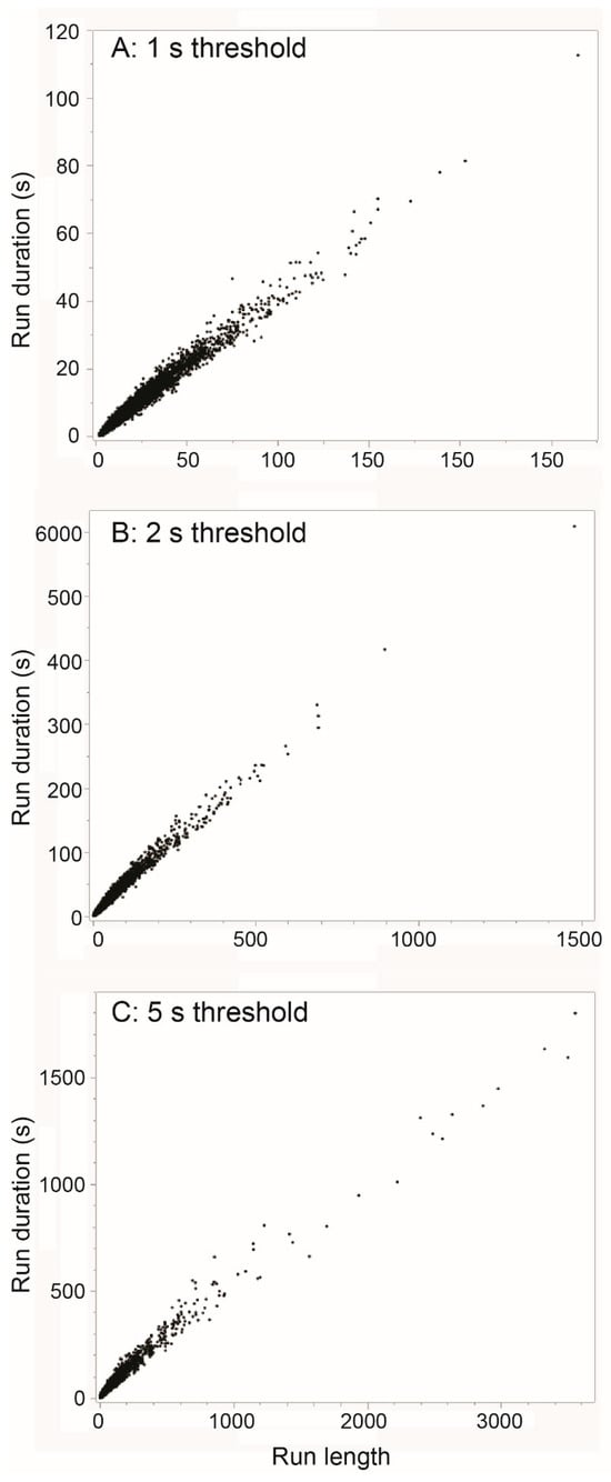 The relationship between run duration (i.e., sum of intervals) (s) and run length (i.e., number of intervals) (-) for three thresholds of the inter-jaw-movement interval: (A) 1 s; (B) 2 s; (C) 5 s. Note that the panels are independently scaled.
