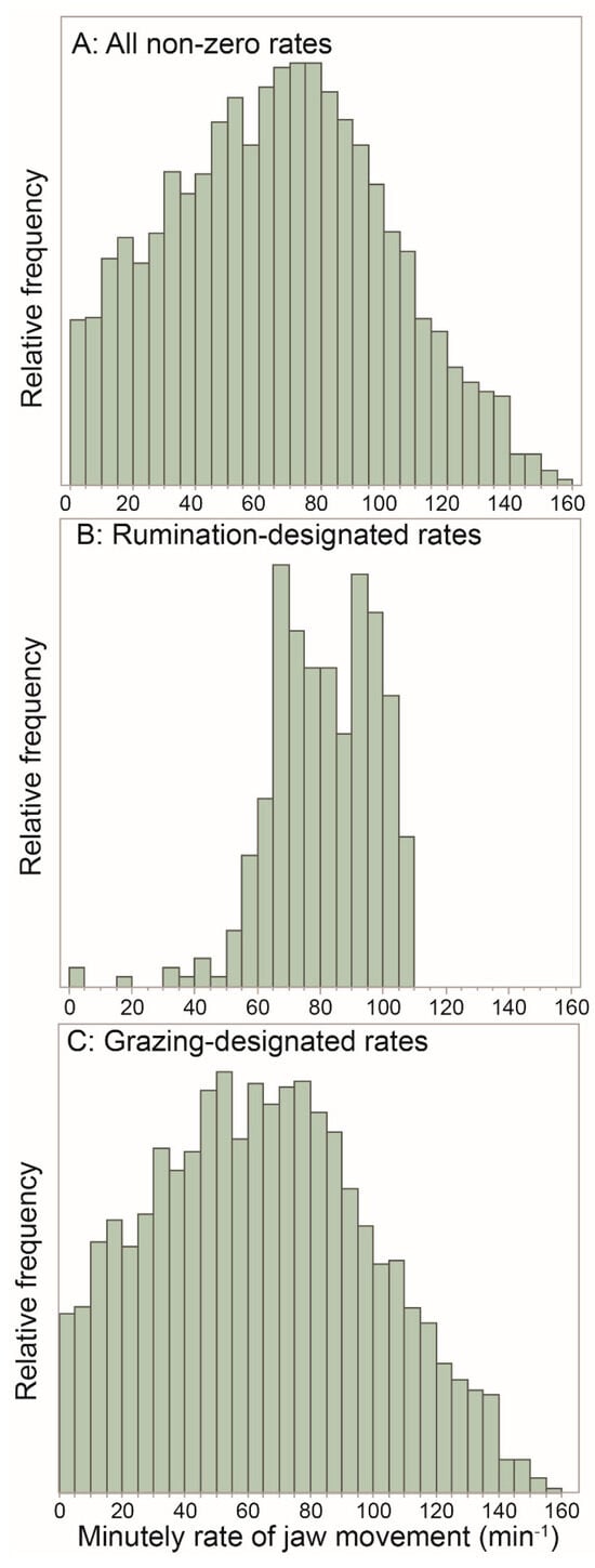 The frequency distribution of non-zero RJM values with the alternative designation of grazing (Figure 7C) was very similar to that of the pooled data and had a similar, but slightly lower, median of 64 JM min−1, considerably lower than the value of 81 JM min−1 for rumination. Given that one-third of RJM values shown exceeded 81 JM min−1, it is clear that the animals were able to sustain episodes of intense grazing that operate at a near-potential jaw movement rate, despite the ostensibly less-than-ideal foraging conditions of the Mediterranean woodland. But another third of RJM values were less than 48 JM min−1, lending credence to the notion of behavioral grazing intensity.