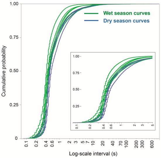 In terms of the mechanistic resolution at which we are able to examine the grazing process, minutely rates hide a finer internal structure and also create a misfitting sub-population of zero values encountered above. Revisiting the interval values shown in Figure 4B, but presenting them as CDFs, addresses both of these issues and enables variability among seasons and foraging routes to be visualized (Figure 8). In terms of their broad features, the interval CDFs were similar across all foraging routes. Nevertheless, there was some degree of separation between the seasons, with the wet-season curves rising more sharply than the dry-season curves, meaning a lower proportion of the longer intervals. A detailed view of the region near an interval of 0.4 s (Figure 8 insert) suggests that the seasonal effect starts with the timing of events at this fine time scale.