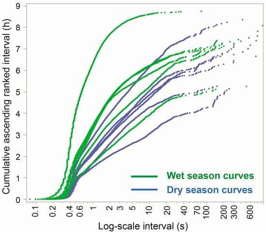 This approach views the animals as having engaged in grazing for the entire duration of the foraging routes, but in a way that incorporated logarithmically scaled breaks and interruptions in the baseline interval. That baseline interval generates the intrinsic unconstrained rhythm of jaw movement activity typical of grazing in a food-saturated environment. Note that at a finer time resolution, it is clear from the event-based plots that the baseline interval (i.e., unitary cycle time) is shorter for ingestive chews than for ruminatory chews. Similarly, it is clear from listening to the recordings that the unitary cycle time of a bite action is longer than that of either type of chew. It is further plausible that the time required for bite formation might be slightly longer when browsing woody vegetation than when grazing herbaceous vegetation, but such a determination is beyond our current scope. The extreme contrast between the wet and dry seasons in terms of vegetation conditions, and most notably the lower abundance and quality of herbaceous vegetation in the dry season, shifts the balance between herbaceous and woody vegetation in the diet [] and would contribute to any seasonal deflection of the curves shown in Figure 8 and Figure 9.