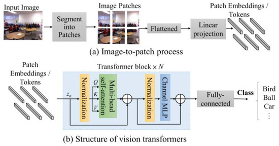 In vision transformers, the input image is segmented into patches, which are then flattened to vectors. Linear projection or 1 × 1 convolution is used for adjusting the length of the flattened vectors as “patch embeddings” or “tokens”. These tokens are then passed through the transformer blocks to capture global information. The basic architecture of a vision transformer block is shown in Figure 1, where the ViT is used to detect the class (bird, car, ball, or ….) of the image. The vision transformer consists of layer normalization (LN), multi-head self-attention (MSA), channel MLP and the residual connections.