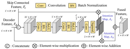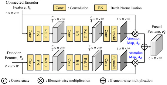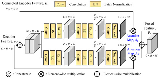 As shown in Figure 13, the adaptive fusion module (AFM) first concatenates the skip connection feature and the decoded feature before being split into two branches for attention map generations. This approach ensures that both branches access the information from two features, thereby enhancing the generation process with more comprehensive and integrated information. By incorporating this strategy, the attention maps Ac and Ad can effectively prioritize crucial information from both features, leading to a better improved performance. It is noted that the SEAFM, which independently generates two attention maps, lacks the knowledge of the information present in the input features. The adaptive fusion module with a better reference of them through the first concatenation can adaptively generate better attention maps.
