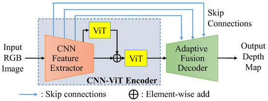 For monocular depth estimation, effectively combining the local information and the global features is an important challenge for the networks to estimate the depth map with exceptional quality. As shown in Figure 4, the basic framework of the proposed residual vision transformer and adaptive fusion (RVTAF) depth estimation network consists of a CNN-ViT encoder and an adaptive fusion decoder. The CNN-ViT encoder is further composed of a CNN feature extractor mixed with several ViT modules in residual configurations to extract local and global features, while the multiple-level features are skip-connected to fuse the feature of the decoder to achieve high-quality depth estimation. In the RVTAF depth estimation network, we need to identify a better residual configuration of vision transformers to successfully expand the receptive field of the bottleneck feature. We also need to design an effective adaptive fusion module to further enhance the precision of the estimation. A detailed explanation of the CNN-ViT encoder and adaptive fusion decoder is present in the following two subsections.