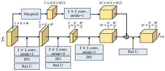 As shown in Figure 6, the subsampled residual block (SRB) has two branches, where the lower branch first projects the input feature to a lower dimension space by 1 × 1 convolution (Conv1) to reduce the number of channels by half. Then, the spatial information is further down-sampled through a 3 × 3 convolution with stride 2, i.e., Conv3_s2, and finally the features are projected to twice dimension of the input feature with 1 × 1 convolution. The upper branch first uses a max-pooling operation to downsize the spatial information by half, followed by a 1 × 1 convolution (Conv1) to double the channel number. Finally, the features from these two branches are combined through element-wise summation to obtain the output SRB feature. The height and width of the input feature (C × H × W) are reduced to half while the channel number is increased twice for the output feature (2C × H/2 × W/2). In formulation expression, the SBR module with the input feature fi and the output feature fi+1 can be expressed as follows: