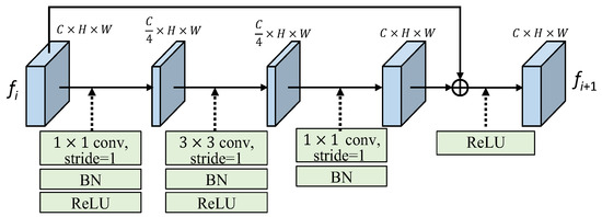 fi+1 = fi + BN(Conv1(ReLU(BN(Conv3(ReLU(BN(Conv1(fi))))))))