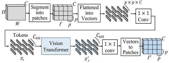 After the vision transformer, the patch embeddings, which have the size of Mvit × 1 × 1, learn a lot of global information. We deploy a 1 × 1 convolution to adjust the lengths of the learned patch embeddings from Cvit to p × p × C. Then, as the flattened procedure, we reverse the process and restore the learned patch embeddings back to their original C × H × W size.