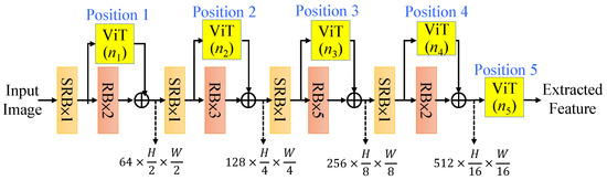 The detailed structure of the final CNN_ViT encoder, which is shown in Figure 5, mainly contains subsampled residual blocks (SRBs) and residual blocks (RBs) to extract 3 intermediate features, F1, F2, F3, and the final bottleneck feature Fo with a size of 512 × H/16 × W/16. Through experiments, the proposed CNN-ViT encoder incorporates vision transformers (ViTs), which are marked in yellow color, and will be further discussed in the subsequent sections. Inspired by ResNet50 [12], the backbone is constructed by two different building blocks to become the CNN feature extractor. In a formulation, the CNN-ViT encoder with the input of the image, I, and outputs of F1, F2, F3 can be expressed as follows: