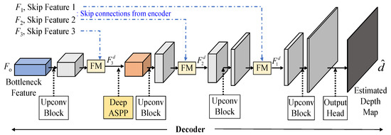 To achieve a good decoder, we believe that feature fusion of skip connections will be the crucial design to achieve an effective autoencoder. The decoder layer could refer to the detailed information of the encoder, which progressively extracts layer features with a global scope. Consequently, effectively integrating the skip connection feature extracted from the encoder with the decoded feature returned by the decoder becomes an indispensable concern. The structure of the adaptive fusion decoder as shown in Figure 10 is composed of up-conversion (Upconv) blocks, fusion modules (FMs) and a Deep ASSP module. In formulation expressions, the adaptive fusion decoder, whose inputs are the connected features F1, F2, F2 and the encoder output features, Fo, finally estimates the estimation depth as follows: