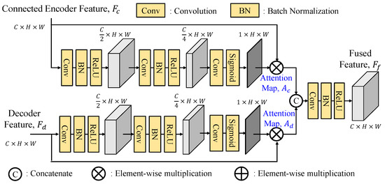 As shown in Figure 11, the separate enhancement addition fusion module (SEAFM) independently enhances the two input features. Comparing to Figure 3, the skip connection feature branch and the decoded feature branch undergo two sequential 3 × 3 convolution-batch normalization-ReLU layers to reduce the number of channels to one-fourth of the original.