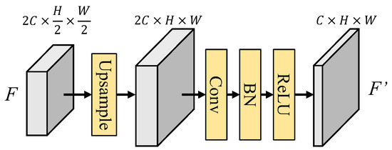 We deploy up-convolution (Upconv) blocks to increase the width and height of the decoded feature and fused features while reducing the number of channels. This step ensures that the feature not only matches the input size of the subsequent AFM but also enhances the precision of spatial information in the up-sampled feature. The architecture of the up-convolution block is shown in Figure 14. The input feature of the up-convolution block will first up-sample to double its width and height, and then pass through a layer of 3 × 3 convolution-batch normalization-ReLU for enhancing the spatial information. In (13–15), the Upconv function is given as follows: