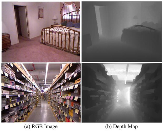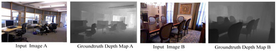 The NYU Depth V2 dataset [33] consists of 120 K image-depth pairs obtained from video sequences captured using a Microsoft Kinect (Redmond, WA, USA). The images have a size of 480 × 640 and are collected from 464 indoor scenes. For training our network, we utilize approximately 50 K training pairs obtained from random crops of size 416 × 544. We evaluate the performance of our approach on 654 testing pairs at full resolution. The depth maps have an upper bound of 10 m. The two selected image-depth pairs in the NYU Depth V2 dataset are shown in Figure 16.
