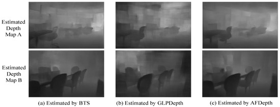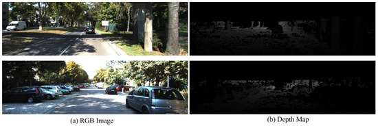 Speaking of an outdoor scene, the KITTI dataset [34] is widely recognized in the field of depth estimation. The KITTI dataset comprises 61 scenes from various categories such as “city”, “residential”, “road”, and “campus”. To ensure fair comparisons with existing methods, we adopt the split proposed by Eigen et al. [18] for training and testing. Therefore, we evaluate our approach on a subset of 652 images across 29 scenes, while the remaining 32 scenes consisting of 23,488 images are used for training purposes. The RGB images have a resolution of approximately 376 × 1241, whereas the corresponding depth maps exhibit low density and contain numerous missing data points. Therefore, we calculate the loss function only for those of the depth map that have valid values. Two selected image–depth pairs in the KITTI dataset are shown in Figure 17. The images are uniformly cropped to a fixed size of 352 × 1216 at a specific position. Afterwards, we train our network using a random crop of size 352 × 704. During evaluation, we utilize the full resolution with the size of 352 × 1216.