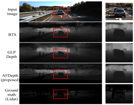 Figure 20 shows visualization comparisons of the depth estimation results achieved by the proposed and the existing approaches in the KITTI dataset. The proposed RVTAF network in the figures also exhibits better depth results than the BTS and GLPDepth methods.
