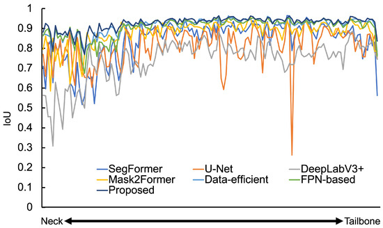 The IoU values of the each model for each dataset are shown in Table 3. The DSC values of each model for each dataset are shown in Table 4. Graphs of IoU for all spine test images for each model are shown in Figure 4. The results of the extraction around the neck, waist, and pelvis of the spine by each model are shown in Figure A2. Table 3 shows that, in the experiment with the data-efficient model, the IoU values are higher than those of SegFormer. Therefore, it can be said that the higher resolution of the feature map and increased convolution layers are effective in improving the extraction accuracy. Furthermore, our data-efficient model demonstrated superior performance compared to other methods such as Mask2Former. In fact, from Figure A2, it can be observed that the data-efficient model accurately extracts the spine with fewer omissions compared to Segformer, U-Net, and DeepLabV3+. From Table 4, we observe that the DSC is higher than the IoU, which also suggests that our method accurately extracts the target regions with minimal segmentation defects. The data-efficient model appears capable of extracting detailed image features from a small dataset.
