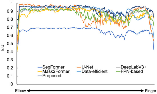 For the proposed model experiment, the IoU improved by 29.3 compared to the SegFormer, by 2.5 compared to the data-efficient model, and by 4.7 compared to the FPN-based model. It also improved by 5.6 compared to Mask2Former. The same precision improvement was observed in the DSC scores. The results of the extraction around the upper arm, palm, and fingers by each model are shown in Figure A3. Comparing the palm and finger images in Figure A3 across each model, the proposed model can accurately extract detailed bone-to-bone gaps with no bone loss compared to U-Net and Mask2Former. Figure 5 shows that the IoU is high for all test images. Furthermore, the proposed model is more accurate in extracting the bones than the data-efficient and FPN-based models. The combination of the two models is particularly effective in improving extraction accuracy.
