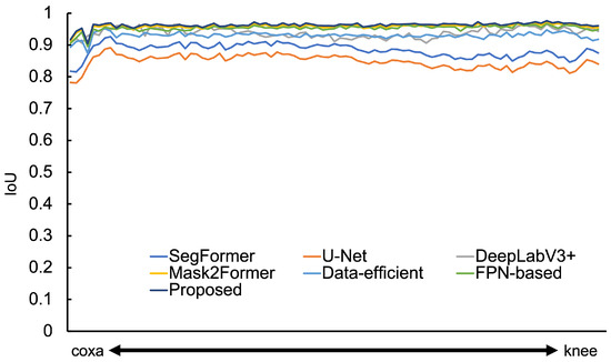 The femur extraction results using each model are shown in Figure A4. Additionally, the IoU graphs for each model across all test images are presented in Figure 6. The data-efficient model improved IoU and DSC by about 4.0 compared to SegFormer. From Figure A4, it is evident that compared to SegFormer, U-Net, and DeepLabV3+, our model extracts the femur more accurately with fewer missing or excess parts. Therefore, even for simple structures like the femur, increasing the number of convolutional layers or improving feature map resolution can be an effective approach to enhancing IoU.