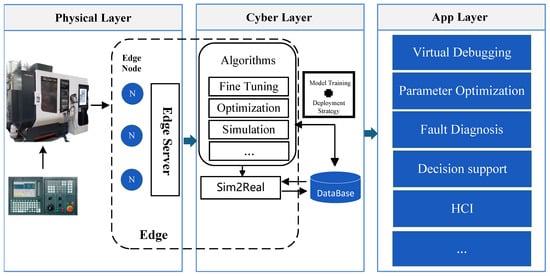 The data processing layer forms the system’s core, consisting of edge access gateways, data parsing modules, data processing modules, and control logic. The edge access gateway handles the integration of different data streams and optimizes data transmission through load-balancing mechanisms. During the data parsing phase, the data fusion module integrates multi-source data and stores these in the data storage module for subsequent analysis and application. The data processing module primarily manages CNC system configuration and core equipment data and ensures data security. Following data processing, the application algorithms and control logic modules conduct further analysis of the processed results, ensuring the accuracy and timeliness of diagnosis and control. Additionally, this layer includes a rule engine and algorithm models for executing complex control strategies and task scheduling.