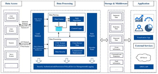 The data access layer connects with CNC systems, sensors, servo systems, and other equipment via industrial protocols (e.g., Modbus, OPC UA, Siemens S7) to enable the real-time collection of machine operation status and machining process data. Simultaneously, IoT protocols (such as MQTT, HTTP/TCP, and WebSocket) are employed to support data transmission from diverse sensing devices and systems, ensuring data collection’s comprehensiveness and real-time nature. Through the coordinated work of load balancing and data acquisition middleware, this layer guarantees that information from various data sources is efficiently relayed to the data processing layer.