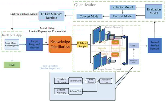 To deploy complex deep learning models on edge devices, knowledge distillation and model quantization have become vital strategies for lightweight models. Knowledge distillation effectively reduces the computational complexity of models while maintaining high performance by transferring knowledge from a teacher model to a student model. The concept of knowledge distillation was first introduced by Hinton et al., who used soft labels to guide the student model’s learning, thereby retaining the predictive capabilities of the complex model [21]. This technique has been widely applied in industrial diagnostics to address the challenges posed by resource-constrained edge devices. In the real-time fault diagnosis of servo motors, He et al. proposed a lightweight network approach based on knowledge distillation, employing an improved MobileNet-V3 as the teacher model to transfer knowledge to a simplified student model. This method achieved approximately 170-fold reductions in computational complexity and parameter count while maintaining an accuracy of 94.37% in RV reducer fault diagnosis [22]. This demonstrates that knowledge distillation can significantly reduce hardware resource requirements while preserving diagnostic performance. Furthermore, Liao et al. developed a lightweight network named BearingPGA-Net, which optimizes model computational efficiency through decoupling knowledge distillation and FPGA acceleration. Experimental results show that this method enhances inference speed by 200 times compared to a CPU, with a performance degradation of less than 0.4Model quantization is another crucial technique for lightweight deep-learning models. Zhong et al. proposed a lightweight approach combining knowledge distillation with adversarial training, significantly enhancing the diagnostic efficiency under small-sample conditions by compressing the parameters of the generative adversarial network [23]. Moreover, Xu et al. utilized transfer learning to optimize an online CNN diagnostic framework, significantly improving the efficiency and accuracy of real-time fault diagnosis [24]. These studies demonstrate that knowledge distillation and quantization techniques offer practical solutions for reconciling the constraints of edge device resources with the demands for high performance, laying a solid foundation for the intelligent, real-time fault diagnosis of servo motors.
