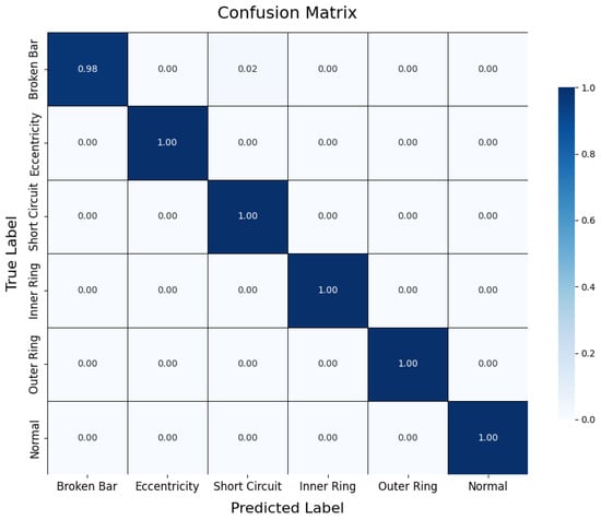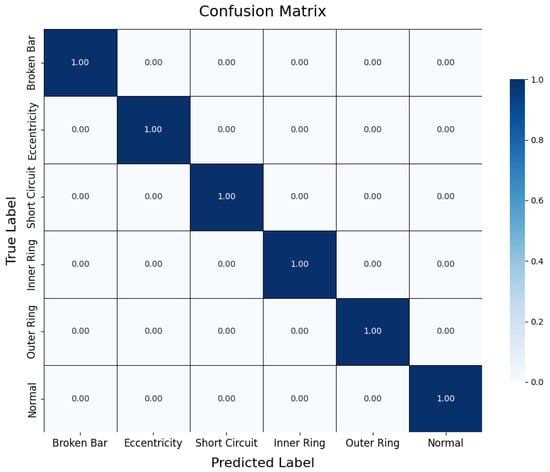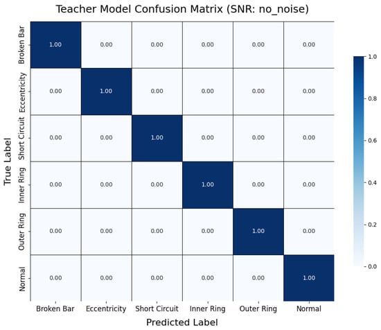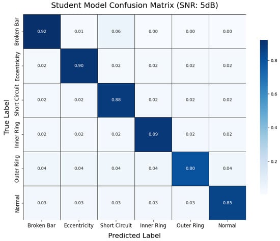 To further analyze the impact of noise on fault diagnosis results at the class level, this section presents two representative confusion matrices. As shown in Figure 18, the teacher model demonstrates nearly error-free recognition across all fault categories under noise-free conditions, highlighting its exceptional performance in ideal signal environments. In contrast, Figure 19 illustrates the classification performance of the student model under 5 dB noise conditions. While the accuracy decreases compared to noise-free scenarios, the student model can still accurately identify most fault categories, with only a limited degree of misclassification observed between a few categories. This result visually underscores the interference caused by noise on feature extraction and classification decisions while also demonstrating the model’s commendable usability under lower SNR conditions.