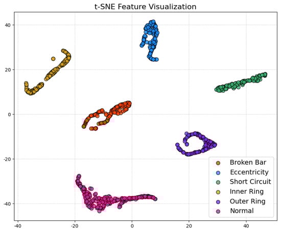 The results demonstrate that the proposed model framework retains a commendable level of robustness when subjected to varying degrees of noise interference. The high accuracy under noise-free conditions is a benchmark, showcasing the model’s exceptional performance with pristine signals. The model sustains a relatively high recognition rate even under the challenging 5 dB noise conditions. This trend can be attributed to the increased interference of noise with signal features at lower SNR levels, which significantly complicates feature extraction and classification processes. Particularly for fault types with similar patterns or subtle distinctions, noise exacerbates the difficulty of differentiation, leading to uncertainty near decision boundaries and consequently reducing classification accuracy.